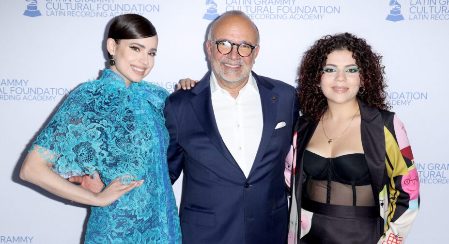 MIAMI, FLORIDA – AUGUST 11: (L-R) Sofia Carson, Manuel Abud, CEO of The Latin Recording Academy, and Valentina Garcia attend the Latin GRAMMY Cultural Foundation Sofia Carson Prodigy Scholarship on August 11, 2022 in Miami, Florida. (Photo by John Parra/Getty Images for The Recording Academy)