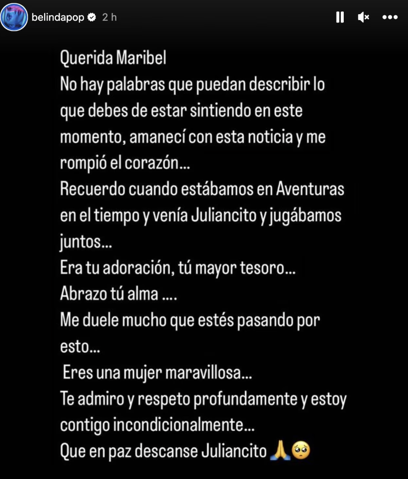 Belinda es una de las miles de personalidades públicas que se han sumado a los mensajes de condolencia por la muerte de Julián Figueroa, único hijo de la actriz Maribel Guardia y el cantante Joan Sebastian.