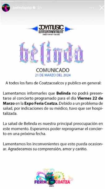 El comunicado de la empresa señala: «Lamentamos informarles que Belinda no podrá presentarse al concierto programado para el día viernes 22 de marzo en la Expo Feria Coatza. Debido a un problema de salud, por indicaciones de su médico, tuvo que ser hospitalizada».